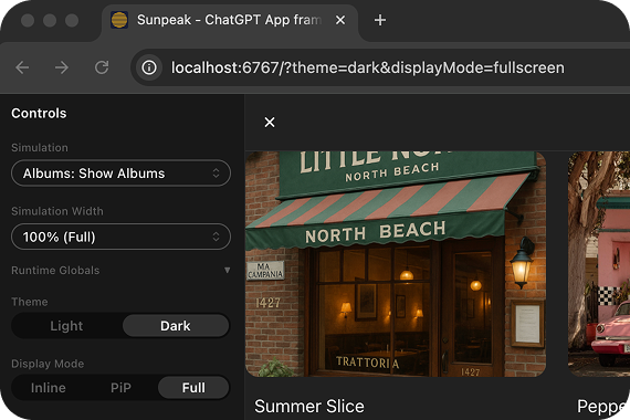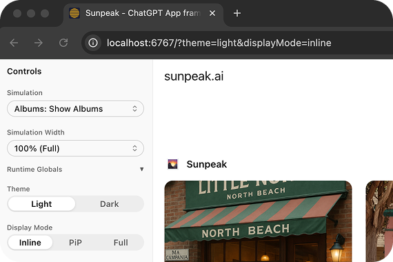 The createSimulatorUrl function accepts parameters for configuring theme, display mode, device type, safe area insets, and more. See the ChatGPTSimulator API Reference for the complete list.